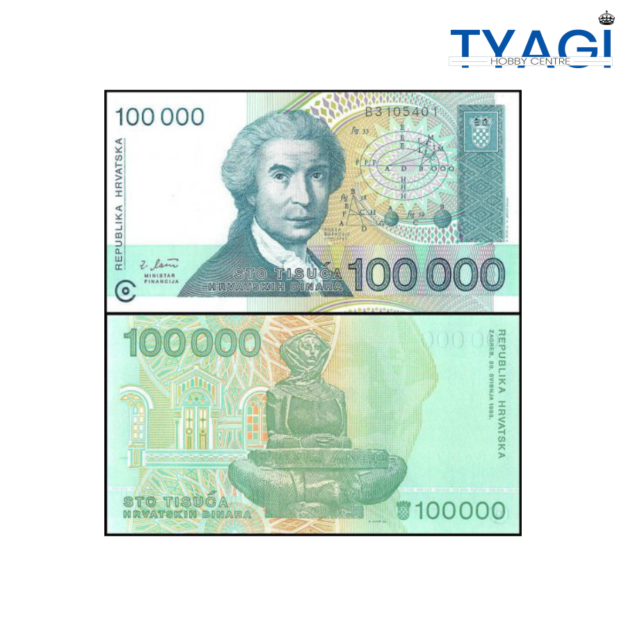 Croatia 100,000 Dinara banknote is in uncirculated (UNC) condition and feature Ruder Boskovic.