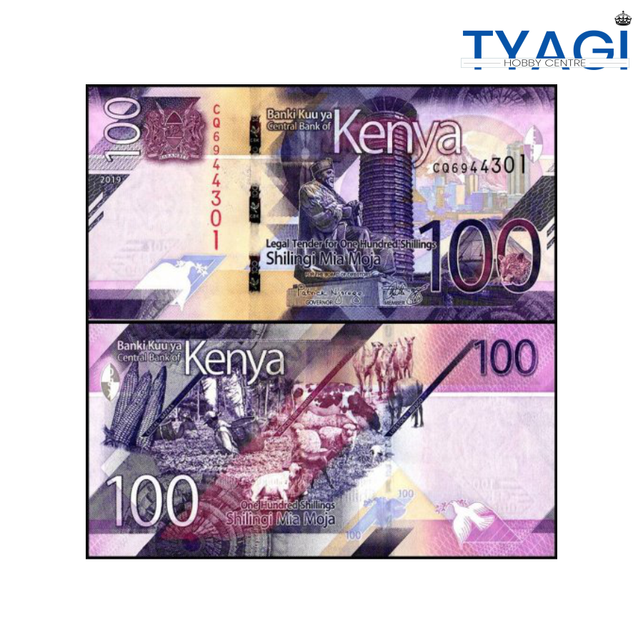 Kenya 100 Shillings banknote is in uncirculated (UNC) condition, and features Kenyatta International Conference Center.