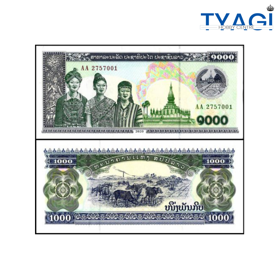 Laos 1,000 Kip Banknote is in uncirculated (UNC) condition and features the Wat That Luang stupa.