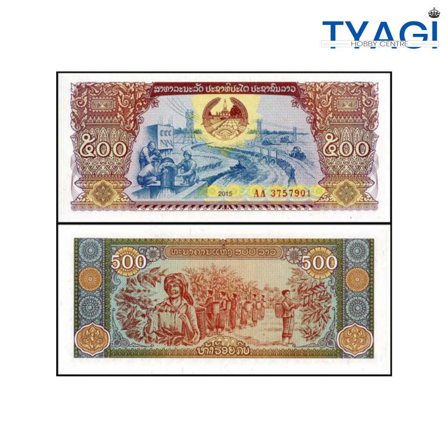 Laos 500 Kip banknote is in uncirculated (UNC) condition and features workers